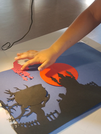Animation de silhouette : Avec des formes, des objets, des personnages, de la végétation en silhouette et un effet de lumière, on déplace les objets en décomposant leurs mouvements pour raconter une histoire.